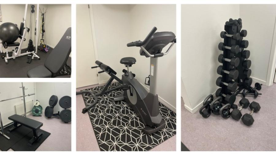 I motionsrummet finns motionscykel, maskin med olika vikter och tillbehör, skivstång med vikter, hantlar, kettlebells och olika motionsredskap som yogaboll, balansbräda mm. Ställ tillbaka vikter, hantlar och annat efter användandet och torka av.